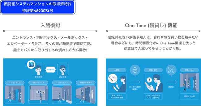 また、⼊居者は、「One Time(鍵貸し)機能」を使って、家族・知⼈にFreeiDアプリを通じて⼀時的な⼊室権限を付与することが可能です。これにより⼊居者が不在の場合でも、家族・知⼈を指定の時間、⾃宅に招待することが可能となります。