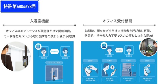 今回の特許取得技術では、物理的なカード等をかざす必要がなく顔認証だけでオフィスへの入退室が可能となります。また、来客者の方は担当者名等の入力が不要となり、顔認証だけ(タイプレス)で担当者呼び出しが可能となります。