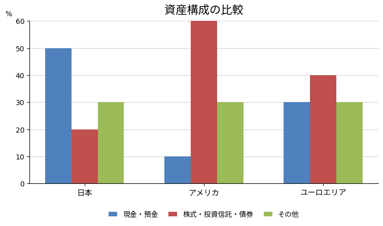 日本の現金・預金の保有率は、諸外国と比較すると非常に高いことがわかります。