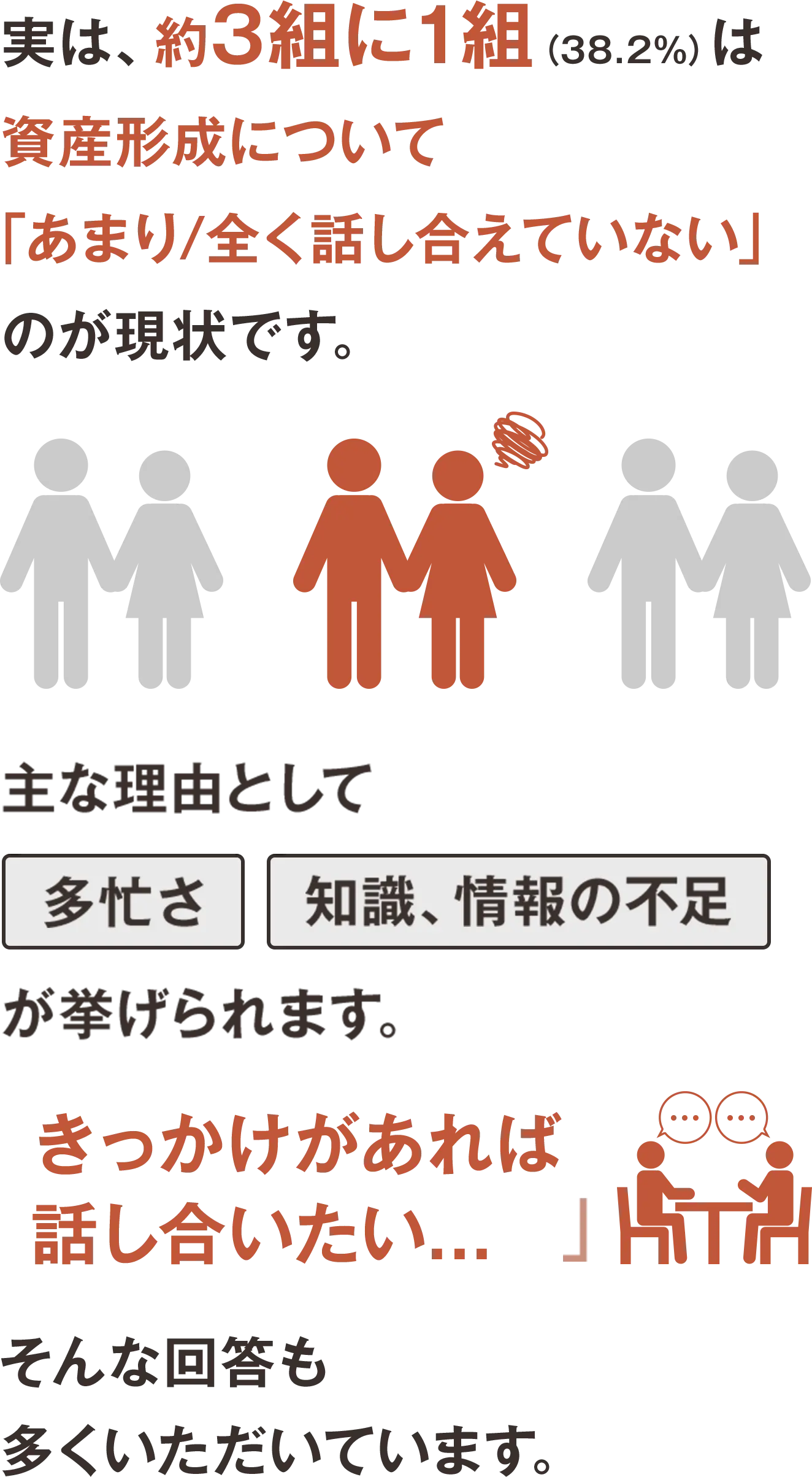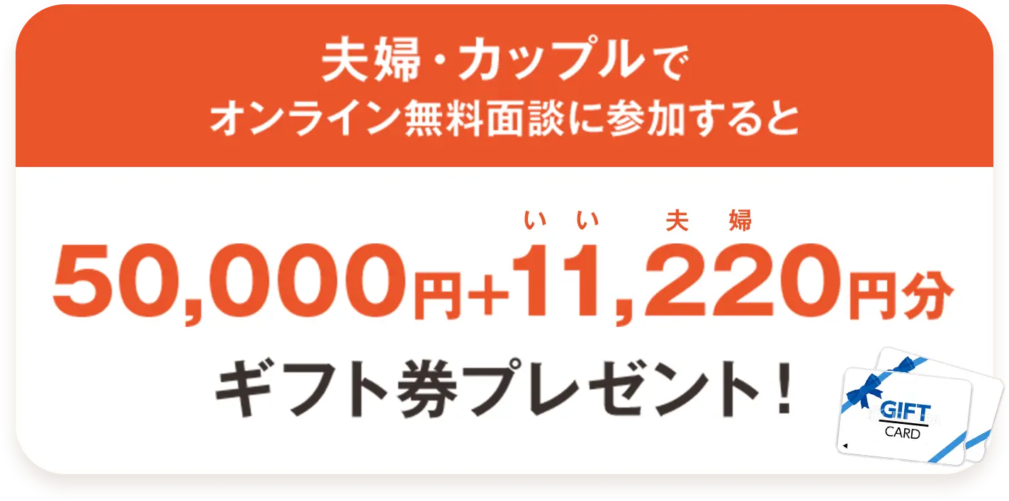 - どちらかお一人でもご参加いただけます。(その場合、面談実施特典は5万円分となります)また、土日や平日夜なども調整可能ですのでお気軽にお申し付けくださいませ。