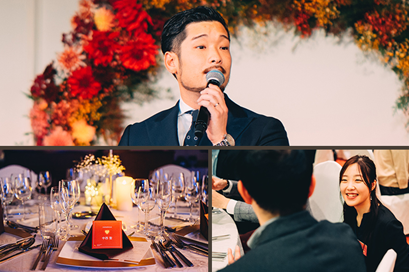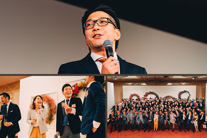 昨年のパーティーでは、緊張の面持ちで乾杯の音頭を取った吉崎。2回目となる今年は、落ち着いた表情でオーナー様に「ひとつのお願い」をさせていただきました。それは、慣れ親しんだ営業担当だけでなく、同じテーブルを囲むさまざまな部門の社員とも、ぜひご親睦を深めてほしいということ。不動産の生命線とも呼ぶべき入居率を担う賃貸管理部門、物件の長期的な維持や修繕を担当する建物管理部門、優良なエリアの調査や選別を行い土地の仕入れ、物件の設計を行う開発企画部門……。ほかにも多くの“縁の下の力持ち”たちが、それぞれ異なる信念を持ち、オーナー様と向き合わせていただいております。実は今年は、パーティーの企画から運営までを社員全員で取り組むという、初の試みにトライ。全社ミーティングや役割別ミーティングを幾度と実施し、どうすればオーナー様に楽しんでいただけるか、徹底的に話し込みました。至らない点もあるかもしれませんが、皆様に最高のひとときをお過ごしいただきたいという思いは誰にも負けません。ご来場いただいたすべての方に精一杯おもてなしすることを誓い、乾杯の音頭を取ります。